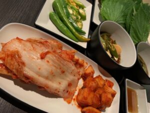 新鮮なサラダだけでなくキムチやナムル、サンチュ、えごまの葉、青唐辛子などもあり、ヘルシー嗜好な方や激辛好きにも嬉しいラインナップ!
